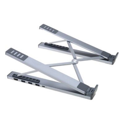 KSh 3,500.00- Robust laptop stand with integrated dock, foldable to compact size (25.3 x 6 x 1.83 cm), ideal for modern hybrid workers travelling between work locations